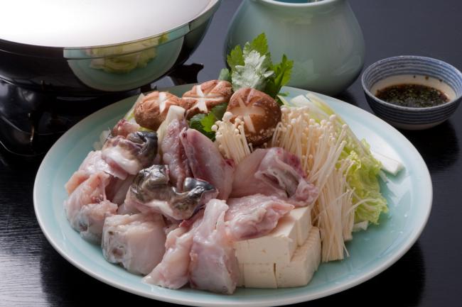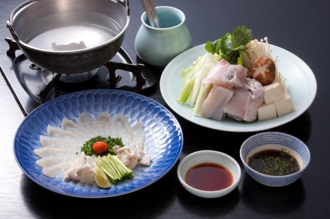・旬のお造り ・ふぐの唐揚げ2貫 ・飛騨牛ロース肉80g / 作豚ロース肉150g ・しゃぶしゃぶ用野菜、豆腐 ・うどん または ごはん ・デザート